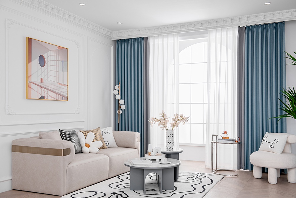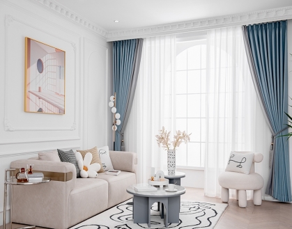 設計理念:純白色的大墻面和米色皮質沙發打造了平和寧靜、純凈治愈的生活空間,添上一抹輕盈清透的天使藍軟飾盡顯疼愛與閑適,與冰川灰輝映浪漫溫柔,讓你沉浸于愉悅而舒適的生活中。