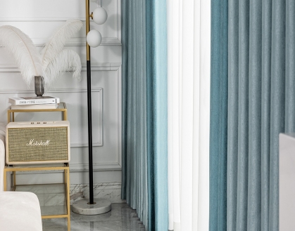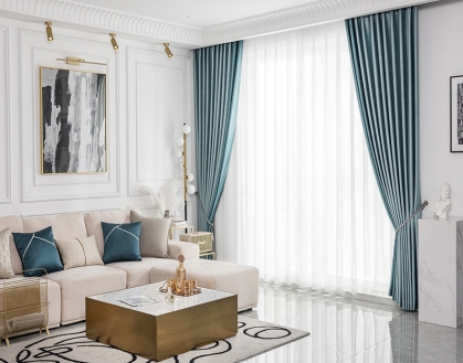 設計理念:亮白色的主題空間內淺松石色和湖水綠攜手暈染整個空間的清爽涼快,在這樣的居室內心中蕩漾著自由愜意,金屬色的畫框茶幾和書報架,視覺上增加了輕奢質感時髦優雅。
